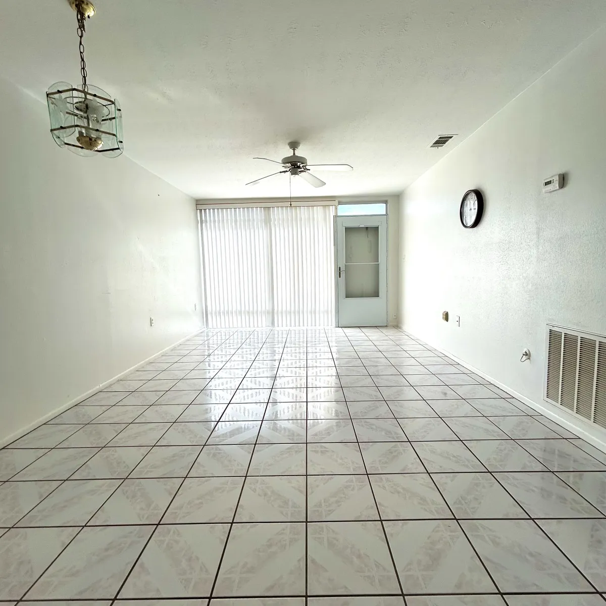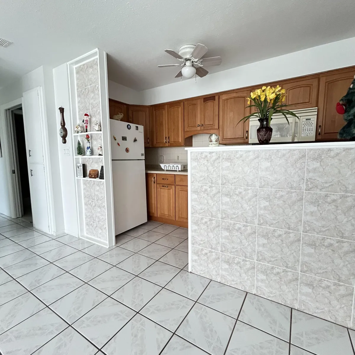Inside, you'll find tile flooring throughout, a remodeled kitchen, and a bright living area with newer windows that let in plenty of natural light. The air conditioning system, installed in June 2024, ensures you stay cool, while the bathroom offers an easily accessible walk-in shower. The unit also includes an in-home washer and dryer for added convenience.